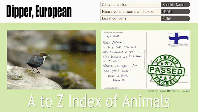 EUROPEAN DIPPER. The white-throated dipper (Cinclus cinclus), also known as the European dipper or just dipper, is an aquatic passerine bird found in Europe, Middle East, Central Asia and the Indian Subcontinent. The species is divided into several subspecies, based primarily on colour differences, particularly of the pectoral band. Read more about European dipper HERE. Listen to European dipper HERE.