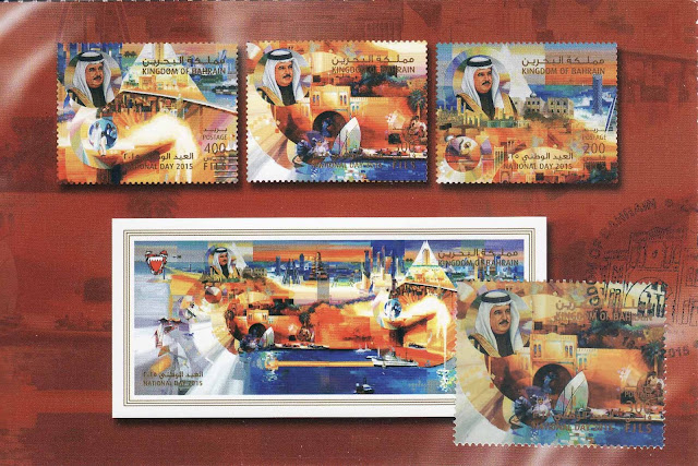 On the occasion of the 44th anniversary of National Day and celebration of the 16th Anniversary of the Accession Day of His Majesty King Hamad bin Isa Al Khalaifa, King of the Kingdom of Bahrain, the Ministry of Transportation and Telecommunication's Bahrain Post is honored to issue a set of three commemorative stamps and souvenir sheet.